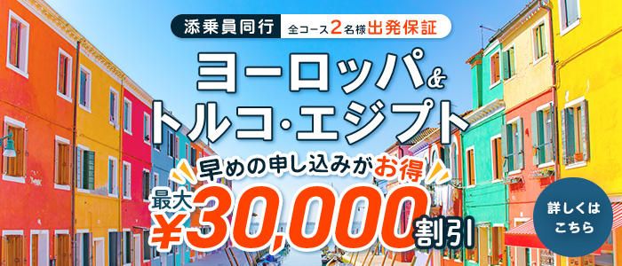 日本旅行トップ> 海外ツアー> 添乗員同行海外ツアー> お知らせ> \早めのお申込みがお得!/ 添乗員同行ヨーロッパ&トルコ・エジプト最大30,000円割引!